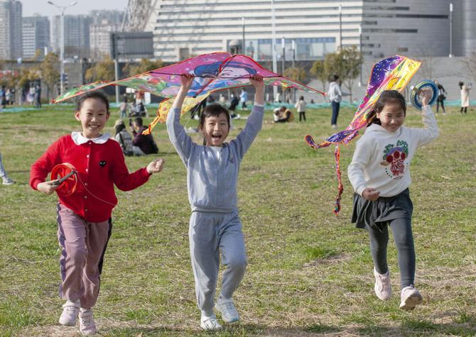 ↑3月6日,小朋友在江苏无锡蠡湖畔放风筝。新华社发(潘正光摄)