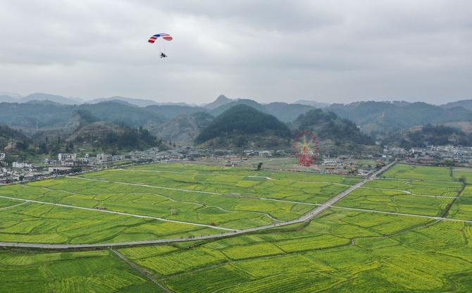 ↑3月6日拍摄的贵州省贵定县盘江镇油菜花田景色(无人机照片)。新华社发(尹刚摄)