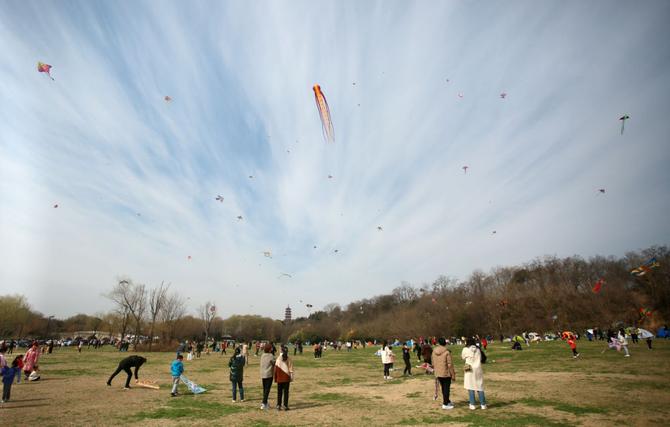 ↑3月6日,市民在江苏省扬州市风筝广场放风筝。新华社发(孟德龙摄)