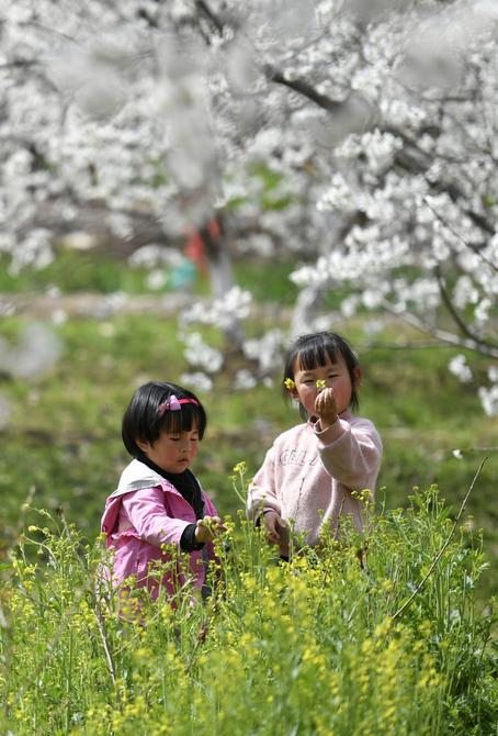 ↑3月6日,小朋友在甘肃省陇南市武都区城关镇石家庄村的种植园内游玩。新华社发(冉创昌摄)