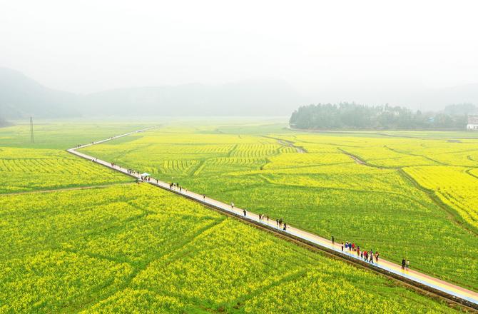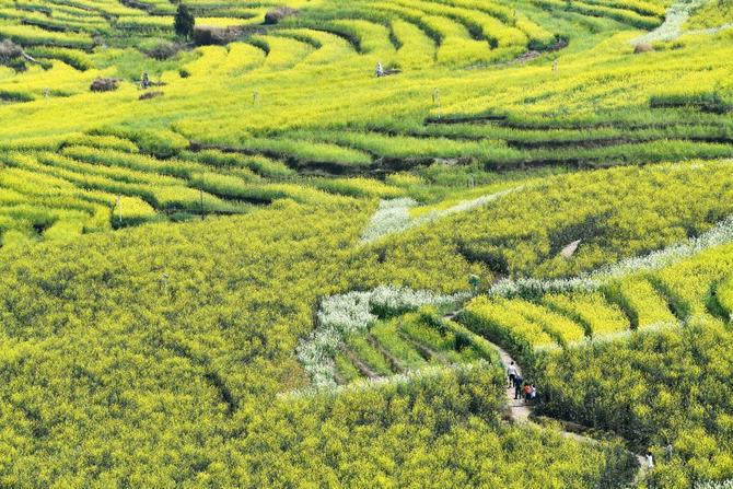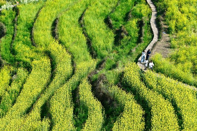 ↑3月7日,人们在贵州省盘州市新民镇旧屯村的油菜花田赏花。