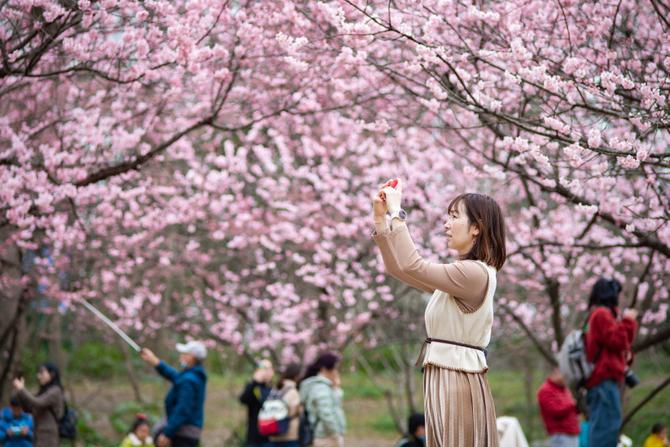 ↑3月7日,游客在江苏南京玄武湖樱桃园拍摄盛开的樱桃花。新华社发(刘建华摄)
