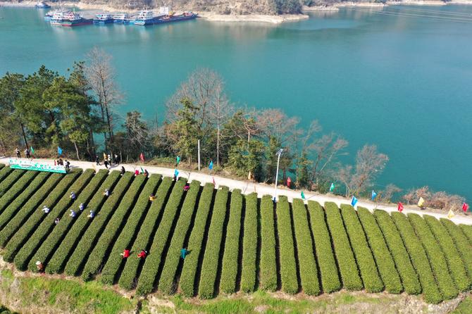 ↑3月4日,人们在湖北省宜昌市夷陵区太平溪镇韩家湾村的茶园采茶(无人机照片)。新华社发(张国荣摄)