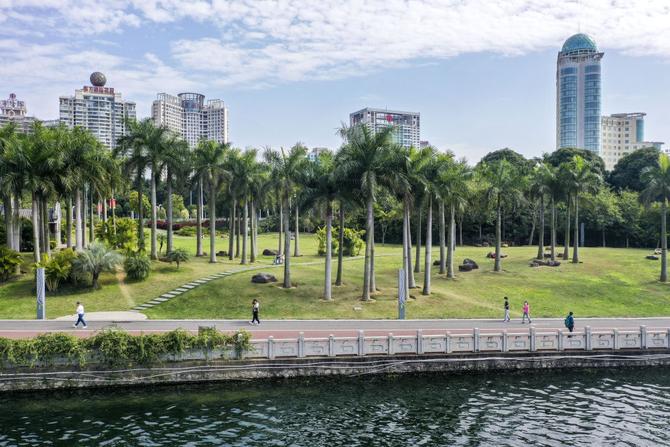 ↑3月7日,市民在广西南宁市南湖畔散步(无人机照片)。新华社记者 曹祎铭 摄