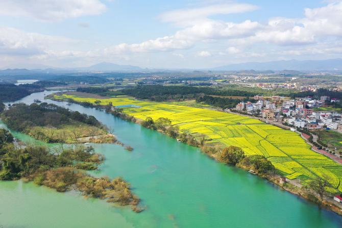 ↑3月7日拍摄的湖南道县祥霖铺镇两河口村的油菜花田(无人机照片)。新华社发(何红福 摄)