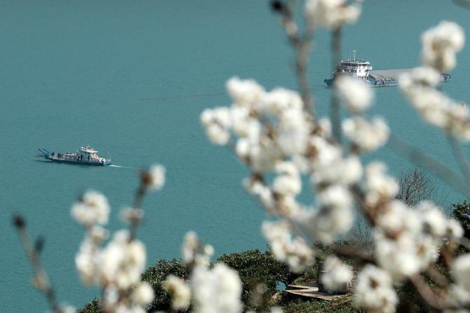 ↑3月7日,轮船行驶在长江湖北省秭归县水域。新华社发(王罡摄)