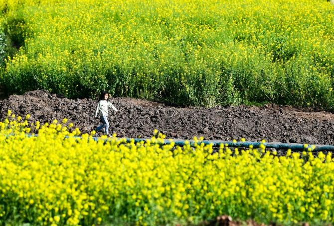 ↑3月7日,小朋友在贵州省盘州市保田镇甘河村的油菜花田边游玩。