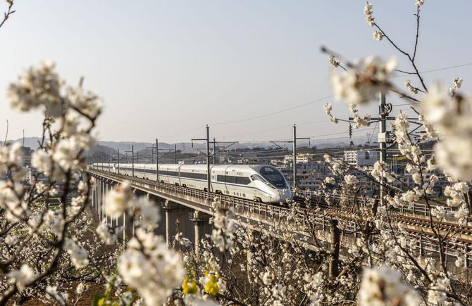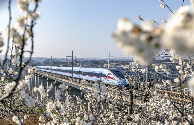 ↑3月7日,动车组列车在成贵高铁贵州黔西段行驶。