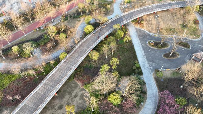 ↑3月7日,市民在贵州省遵义人民公园游玩(无人机照片)。
