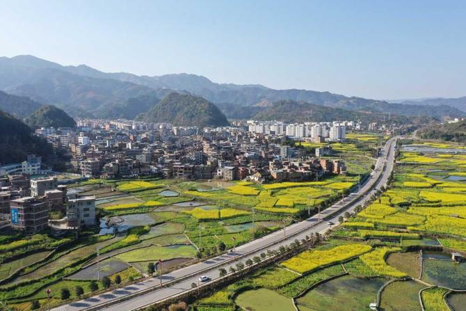 ↑在贵州省从江县贯洞镇,乡村公路两边的油菜花竞相绽放(3月7日摄,无人机照片)。