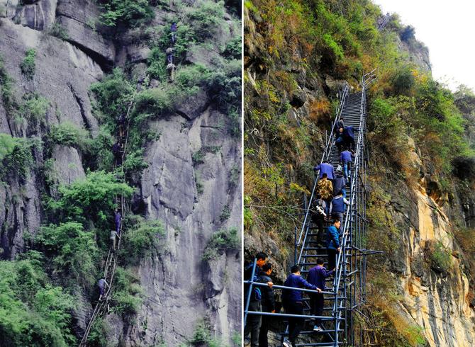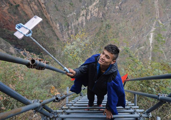 某色苏不惹在通往“悬崖村”的钢梯上直播(2017年12月15日摄)。