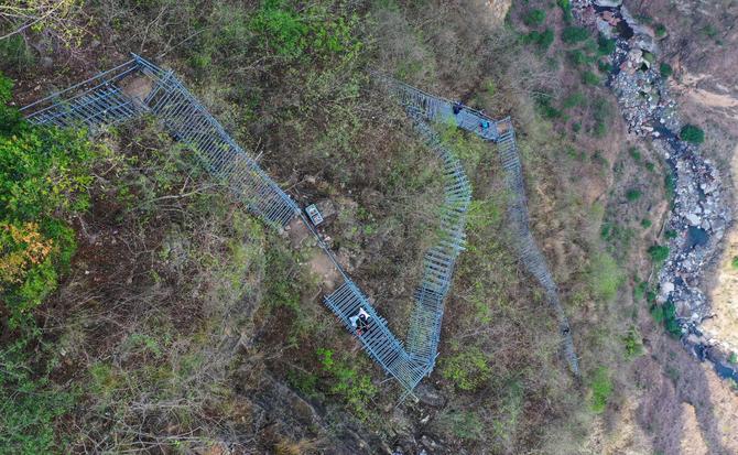 在四川省凉山彝族自治州昭觉县阿土列尔村的悬崖钢梯上,村民沿着钢梯下山(2020年5月13日摄,无人机照片)。