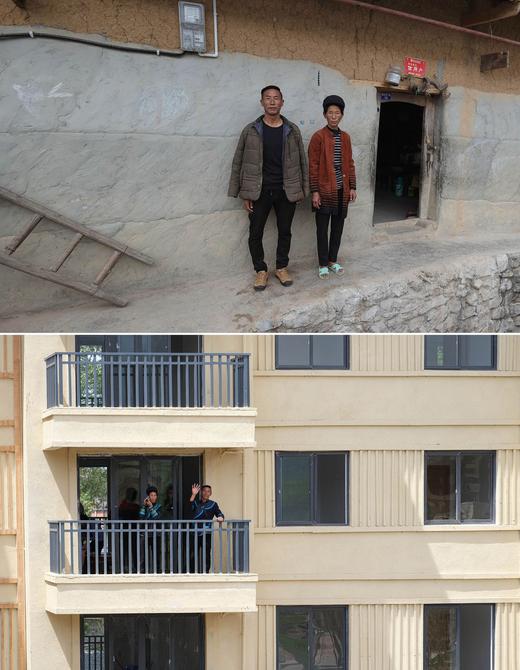 拼版照片:上图为四川省昭觉县阿土列尔村村民某色达体夫妇在“悬崖村”的家门口拍照留念(2020年5月13日摄);下图为某色达体夫妇在昭觉县城易地扶贫搬迁安置点南坪社区新家的阳台上挥手(2020年5月13日摄)。