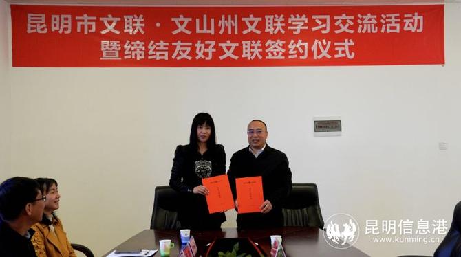 昆明信息港讯 记者罗文忆 3月8日,昆明市文联与文山州文联缔结友好文联签约仪式在昆明举行。此次缔结友好文联旨在加强昆明、文山两地文联互通合作,实现文艺资源共享。