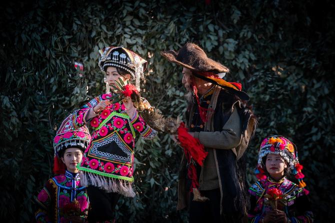 农历二月初八,在大姚县昙华乡千柏林,随着德高望重的毕摩给昙华新晋的“花仙子”带上当地象征“繁荣、昌盛”的马缨花,祈福人寿年丰,一年一度的“彝族插花节”直播就此拉开序幕。祈福仪式过后,本届“花仙子”和“百灵鸟”们送上热情四溢的“拦门酒”,邀四方来客入乡一同参加欢乐的节庆活动。