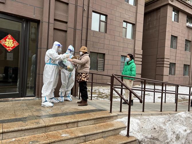 在确诊病例和无症状感染者所居住的小区,为了保障封控期间居民的基本生活物资需求,吉林市经过核酸检测阴性的机关干部和社区志愿者组成了志愿者服务队,从3日开始为小区居民配发蔬菜包,一包中有近十样蔬菜,按户按份配送到位。龙城帝景小区居民告诉记者:“发的有黄瓜、茄子、土豆、大头菜,还有芹菜,挺全的。我们觉得现在这种情况下吃三天也没有问题。”