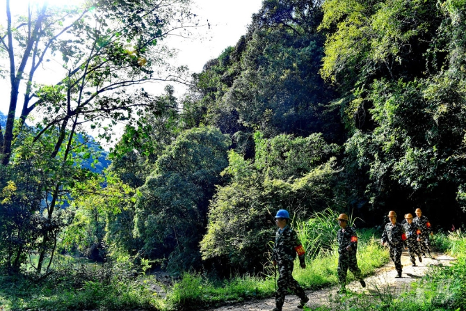 2017年10月13日,护林员在福建省南平市建阳区富兴林区巡山护林。