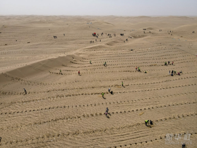 人们在距离新疆且末县城不远处的塔克拉玛干沙漠内植树(无人机照片,2021年3月28日摄)。
