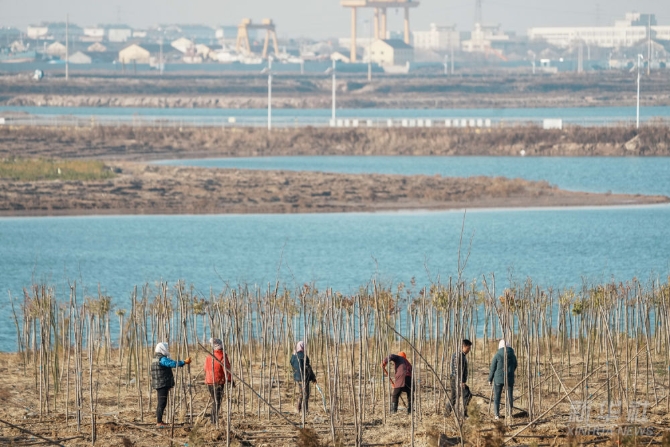 村民们在山东寿光羊口港种植树木(2021年12月2日摄)。