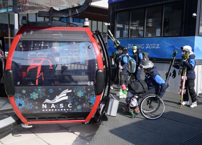 2月28日,运动员在国家高山滑雪中心乘坐缆车。新华社记者张晨霖摄