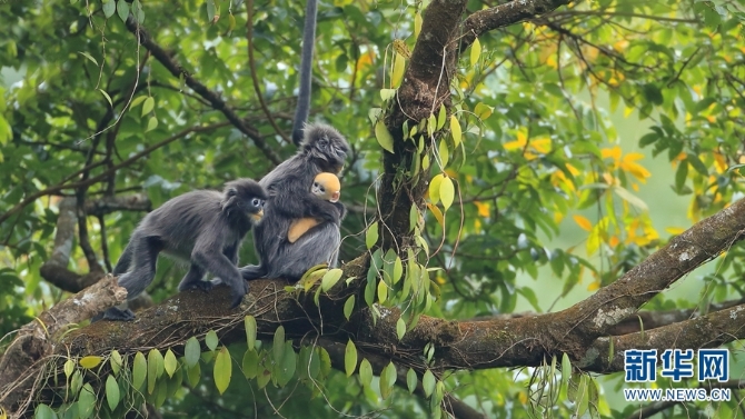 云南素有“野生动物王国”之称,春日里,“小精灵”们或在花间觅食,或在林间漫步,有的还诞下了“小宝宝”,一派生意盎然。图为德宏州芒市,摄影师拍摄到一只全身金黄的菲氏叶猴宝宝。每年1月至3月,是菲氏叶猴集中繁殖的季节,刚出生的猴宝宝全身金黄,十分可爱(摄于2月21日)。新华网发(郑山河/摄)