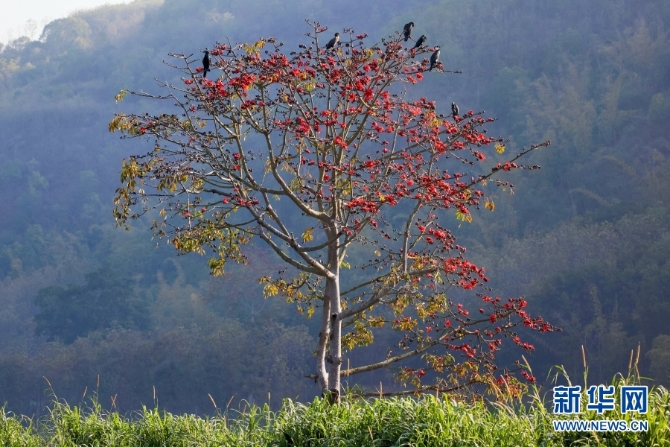 保山市龙陵县,怒江之畔,木棉花开引鸟来(摄于2月16日)。新华网发(尹磊/摄)