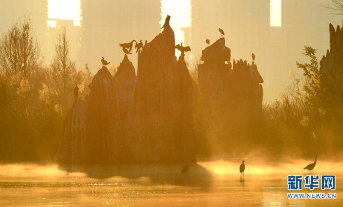 红河州弥勒市湖泉生态园内,成群的水鸟沐浴在晨光里(摄于2月16日)。新华网发(普佳勇/摄)