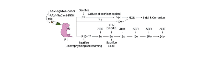 据世界卫生组织(WHO)官网报道,全球约有4.66亿人患有致残性听力障碍,其中3400万是儿童。临床上对于遗传性感音神经性聋的治疗,除了佩戴助听器和植入人工耳蜗等方式外,尚无任何有效的治疗手段。在非综合征型遗传性耳聋中,常染色体隐性遗传性耳聋占80%。治疗这类疾病,最佳方法是精准修复相应的基因突变位点,使听力恢复。CRISPR/Cas9基因编辑系统是近年来兴起的新型基因编辑工具,已在遗传疾病治疗中表现出了巨大的应用潜力。