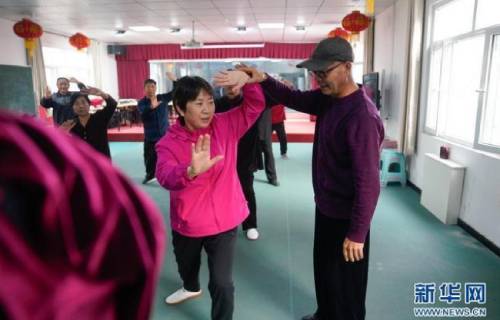 黄骅市骅东街道老年活动中心学员在老师指导下学习太极拳。