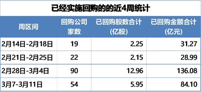 与此同时,54家上市公司在上周已经回购的股份达5.95亿股,累计回购金额为84.1亿元。数据显示,除了明显低于前一周(2月28日-3月4日)之外,均明显高于2月份其他两周。