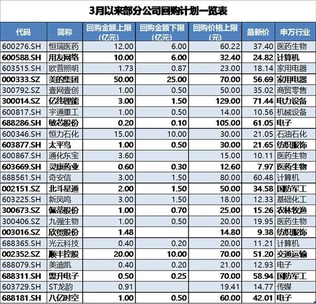 尤其是3月10日以来,包括恒瑞医药、美的集团、恒力石化、用友网络、欧普照明、亿纬锂能等知名公司均推出了大额回购计划,3月10日和11日分别有4家和6家披露了回购计划,上市公司掀起了“回购潮”。