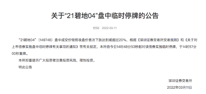 3月11日,深圳证券交易所发布公告称,碧桂园地产集团有限公司(简称碧桂园地产)旗下“21碧地04”(149748)盘中成交价较前收盘价首次下跌达到或超过20%,根据有关规定,深交所自当日14时48分53秒起对该债券实施临时停牌,于14时57分00秒复牌。