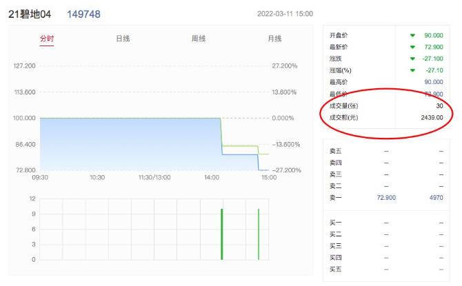 令人震惊的是,存续规模10亿元的“21碧地04”债券3月11日暴跌27.10%、触发临时停牌的背后,成交金额仅2439元,且成交均发生在14时以后。上一次出现2400多元“砸停”数亿规模债券的房企是阳光城。(详见:震惊!8亿规模债券被2460元砸停牌!房企债券频遭做空,两大手法揭秘)