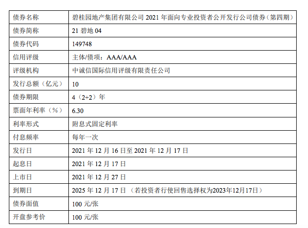 债券资料显示,“21碧地04”发行规模和存续规模均为10亿元,票面年利率为6.30%,于2021年12月27日上市,债券期限为4(2+2)年,到期日为2025年12月27日。