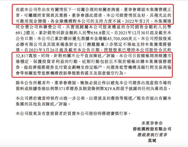 此外,碧桂园控股股东必胜有限公司及其股东杨惠妍女士(控股股东)亦坚定不移地支持集团业务发展。自2021年3月26日起及截至公告日期,控股股东已增持公司股份合共约32817万股。