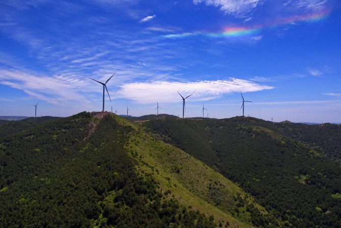 2018年5月23日拍摄的壶关县常家池村附近山上的风力发电机。新华社记者曹阳 摄