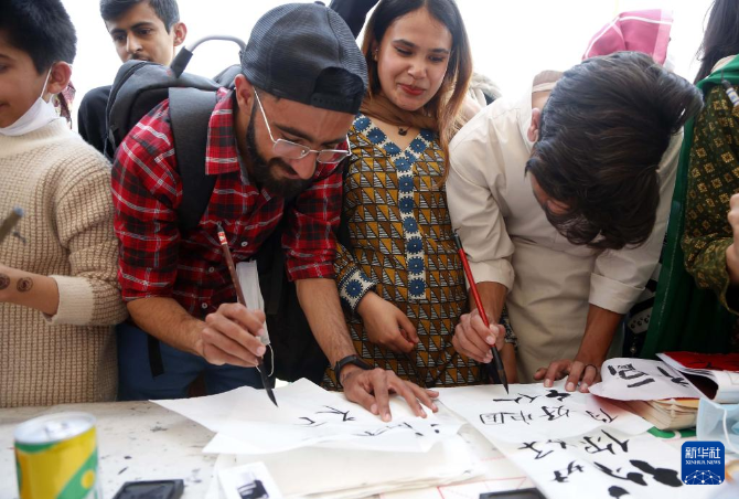3月14日,在巴基斯坦伊斯兰堡,学生在巴基斯坦国立现代语言大学国际文化节上学习中国书法。新华社发(艾哈迈德·卡迈勒摄)