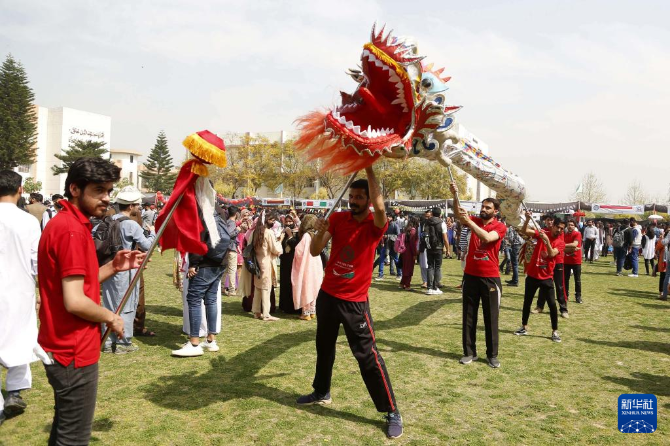 3月14日,在巴基斯坦伊斯兰堡,学生在巴基斯坦国立现代语言大学国际文化节上表演舞龙。新华社发(艾哈迈德·卡迈勒摄)