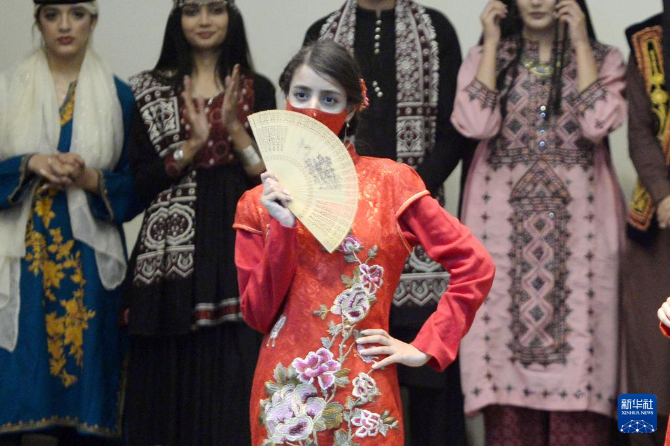3月14日,在巴基斯坦伊斯兰堡,表演者在巴基斯坦国立现代语言大学国际文化节开幕式上展示中国民族传统服饰。新华社发(艾哈迈德·卡迈勒摄)