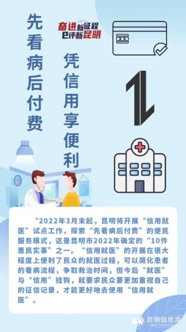 2022年3月末起,昆明将开展“信用就医”试点工作,探索“先看病后付费”的便民服务模式,这是昆明市2022年确定的“10件惠民实事”之一。