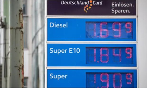 德国法兰克福一个加油站显示的油价。俄乌冲突爆发后,欧洲油价暴涨。(图片来源:新华社)