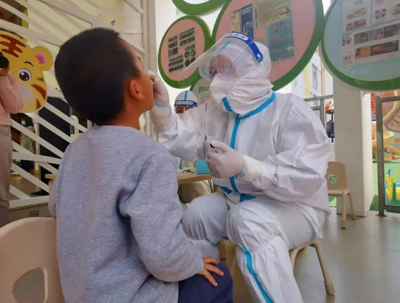 3月16日上午9点,呈贡区第三幼儿园的师生们自觉佩戴口罩,学生在老师的引导下,按照检测顺序进行采样,医护人员与师生们各司其职,配合默契,采样过程快捷高效,秩序井然,仅用了一小时就完成了全园师生的核酸采样工作。