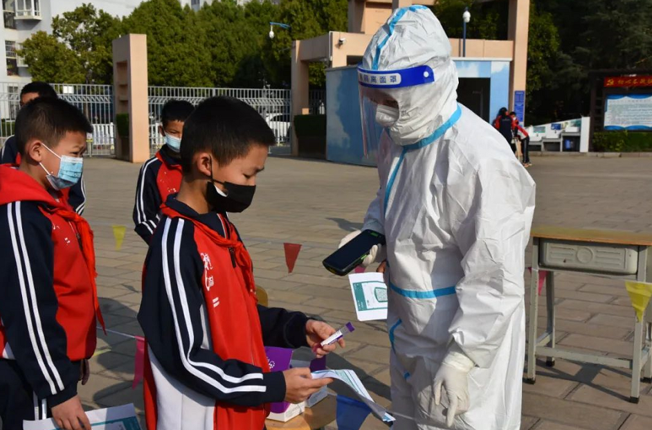 呈贡区洛龙学校(云南民族大学呈贡学校)在检测前,对学生身份信息进行再确认再核对,确保信息准确无误。检测时采取“分班级,错时段,即采即走”的方式进行。全体学生和教职工排着整齐的队伍,佩戴口罩,间隔1米,10人为一组,井然有序排队等候检测,医务人员核对信息无误后进行采样。检测现场井然有序,顺利完成了全校372名学生、教职工的核酸检测。