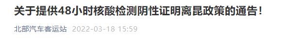 由于我市疫情防控形势严峻复杂,为进一步贯彻落实“外防输入、内防反弹”的总体策略,严密防范疫情外溢,根据3月18日昆明市应对疫情工作小组指挥部文件《关于提供48小时核酸检测阴性证明抵(离)昆政策的通告》要求,从3月19日起离昆人员(除:石林、宜良,汤池)需提供48小时内核酸检测阴性证明方能进站购票乘车!