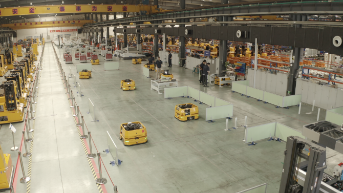沈阳海尔冰箱智能工厂一栋占地7.8万平方米的厂房里,智能运送设备在地上和空中来回穿梭,生产线上尽是忙碌的机械手,每10秒就能下线一台冰箱。
