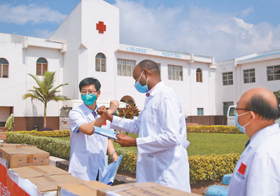 中国第二十二批援卢旺达医疗队不久前向卢旺达东方省的基本戈医院捐赠了一批医疗和抗疫物资,包括医用防护服、一次性无菌手术衣、医用外科口罩等。图为中国医疗队队长彭际奎(左)向该院院长加希马·约翰交接捐赠物资。新华社记者 吉 莉摄