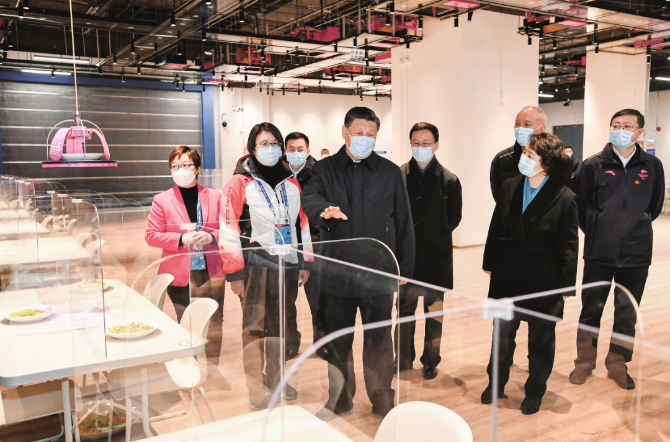 2022年1月4日,中共中央总书记、国家主席、中央军委主席习近平在北京考察2022年冬奥会、冬残奥会筹办备赛工作。图为1月4日上午,习近平在北京冬奥会、冬残奥会主媒体中心智慧餐厅,察看智能餐饮设备运行情况。图/新华社记者 谢环驰 摄