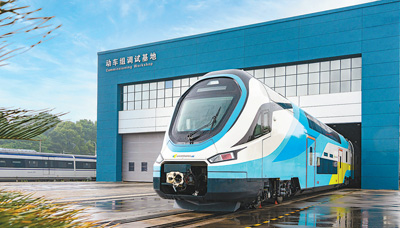 中国首列出口欧洲的双层动车组在位于湖南省株洲市的中车株机公司下线。中车株机公司供图