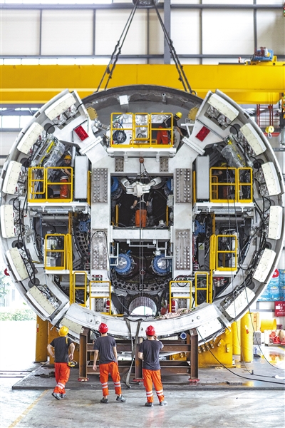 广东省佛山市顺德区,在中铁华隧联合重型装备有限公司生产车间内,工人正在组装盾构主机。魏劲松摄(影像中国)