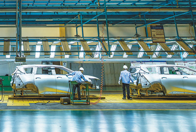 在海南省海马汽车海口基地的焊装车间内,工人进行流水线作业。康登淋摄(影像中国)